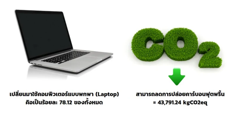 นอกจากนี้บริษัทได้ดำเนินการ เปลี่ยนอุปกรณ์สำนักงานประเภทคอมพิวเตอร์ตั้งโต๊ะ (PC) โดยเปลี่ยนมาเป็นอุปกรณ์คอมพิวเตอร์แบบพกพา (Laptop) ที่มีความสามรถในการกินไฟน้อยกว่า โดยประเภทคอมพิวเตอร์ตั้งโต๊ะ (PC) กินไฟประมาณ 300-800 วัตต์ต่อเครื่อง ส่วน คอมพิวเตอร์แบบพกพา (Laptop) กินไฟประมาณ 100-300 วัตต์ต่อเครื่อง ในปัจจุบันเจมาร์ทสำนักงานใหญ่มีการใช้คอมพิวเตอร์ตั้งโต๊ะ (PC) รวม 192 เครื่อง ในจำนวนนี้บริษัทได้เปลี่ยนมาใช้อมพิวเตอร์แบบพกพา (Laptop) จำนวน 150 เครื่อง คิดเป็นร้อยละ 78.12 ของจำนวนคอมพิวเตอร์ทั้งหมด ทำให้ประหยัดการใช้พลังงานไฟฟ้าประมาณ 87,600 kWh/ปี สามารถช่วยลดการปล่อยคาร์บอนฟุตพริ้นได้ประมาณ 43,791.24 kgCO2eq โดยใช้วิธีการคำนวณจากคู่มือการรายงานความยั่งยืน